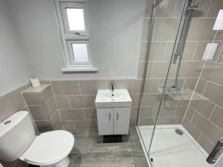 Suite comprising tiled walk in shower, wash hand basin, low level WC, extractor fan.